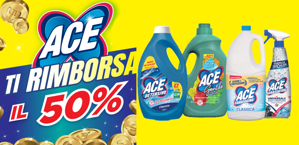 - Ti verrà rimborsato il 50% di quanto speso in prodotti ACE fino a un massimo di 7 euro.