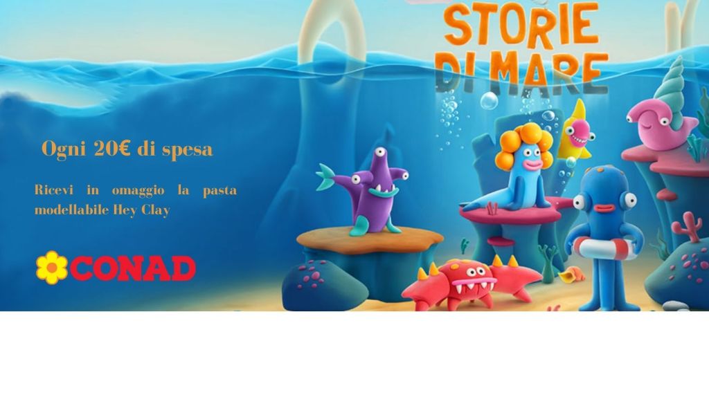 Dal 27 febbraio al 9 aprile 2023 ogni 20€ di spesa ottieni una bustina che contiene la pasta modellabile Hey Clay e un bollibro. Colleziona 20 bollibri per ottenere il libro Storie di Mare.