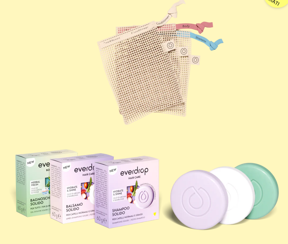 Riceverai gratuitamente candidandoti a everdrop lo starter kit di cosmetici solidi pelle & capelli che combrende: