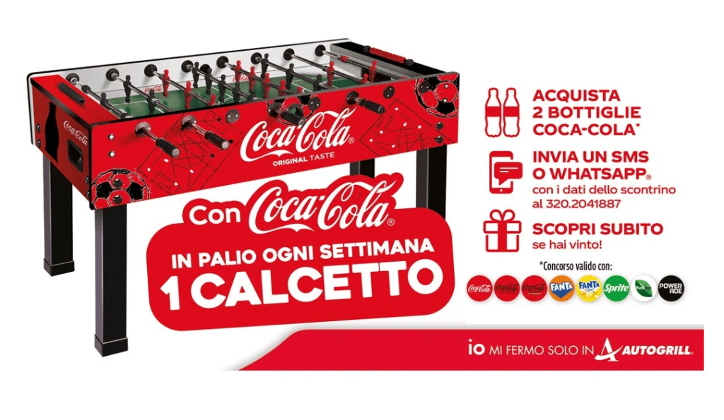 Coca-Cola, in collaborazione con Autogrill, lancia un nuovo concorso a premi che offre la possibilità di vincere ogni settimana un biliardino brandizzato del valore di circa 475€. Partecipare è semplice: basta acquistare almeno due bevande promozionate nei bar Autogrill aderenti in Italia. Ecco tutti i dettagli per partecipare e avere una chance di vincita!